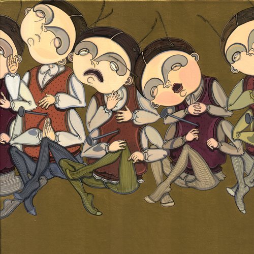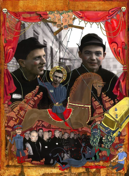 The artwork of Yana Payusova can not be viewed simply on a visceral level without being asked to see the social commentary and to decipher numerous embedded symbolic elements. This particular body of work was inspired by Payusova’s experience of studying and listening to personal stories of incarcerated teenagers (14-21 year-old boys) at Lebedeva and Kolpino prisons in St. Petersburg. Many of them became the victims of the economic chaos that followed the breakup of the Soviet Union. Searching for an answer to a profound question of “What is a society’s role in labeling these young men as criminals, convicts, felons and sinners?” is the philosophical underpinning of Payusova’s work.
