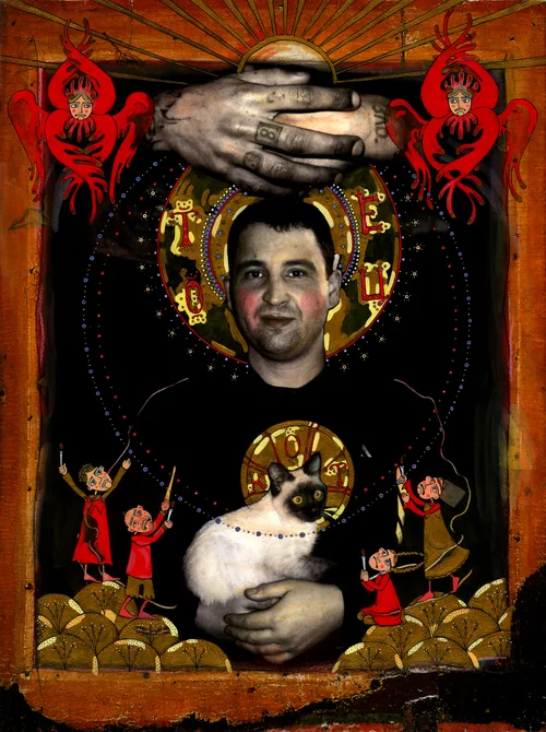 In order to answer this question, she constructs a visual language where the traditional black and white photographic imagery is mixed with the iconographic and symbolic elements of Russian Christian Orthodox culture from the twelfth to fifteenth centuries. Combining the realistic quality of digital imagery (young mens’ faces) with a visionary quality of painting (the overall imagery) allows the intricate and quintessentially Russian elements to assume an avant-garde design. She strives to unite the traditional and nonconformist to transform the one-dimensional meaning into a purely modern composition. Every painting becomes a poetic invitation into the subjects’ life, thoughts, pain and sufferings.